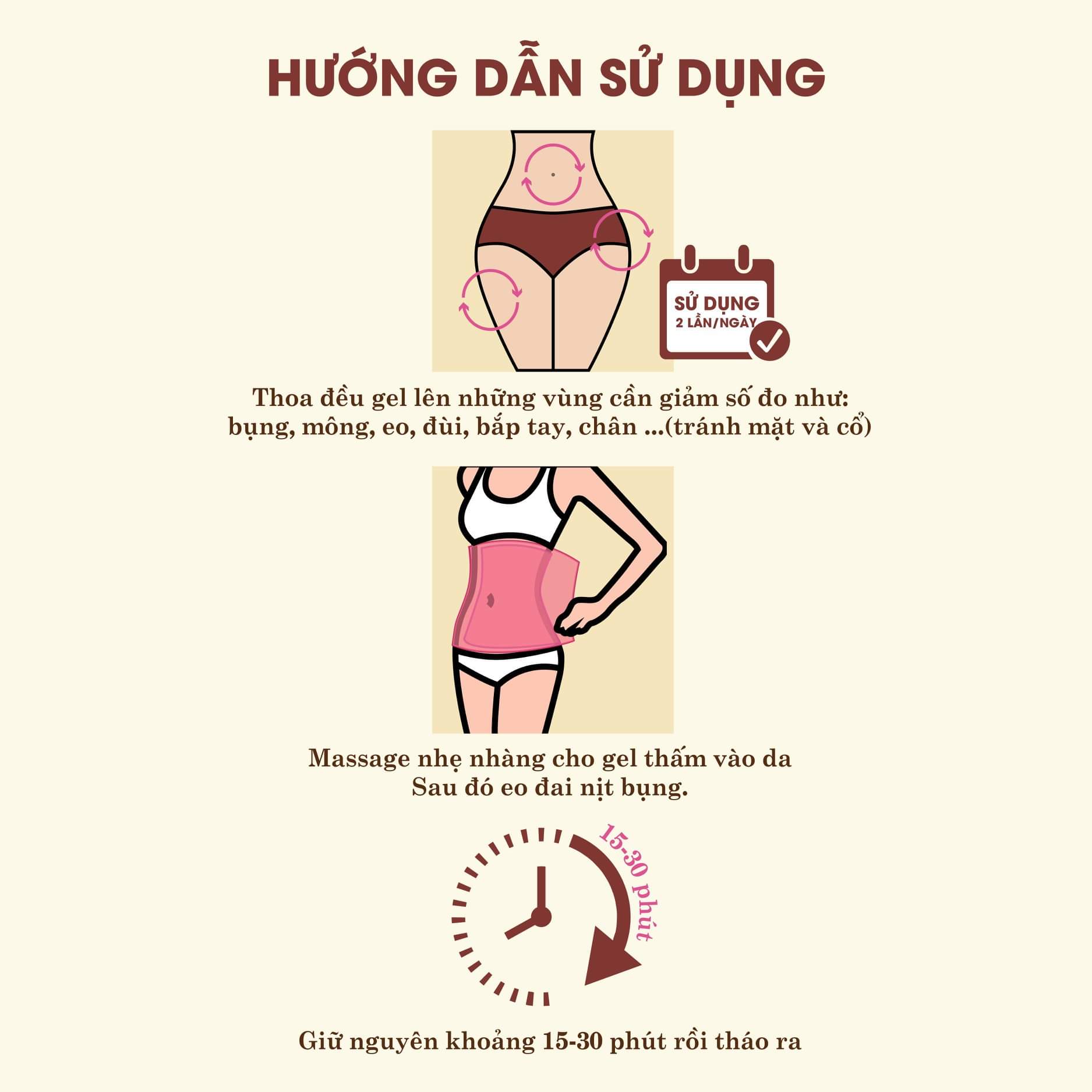 Dùng 2 lần/ ngày (sáng, tối), thoa đều gel lên những vùng cần giảm số đo như: bụng, mông, eo, đùi, bắp tay, chân …(tránh mặt và cổ) và massage mạnh cho đến khi hấp thụ hoàn toàn vào da (khoảng 15 phút).