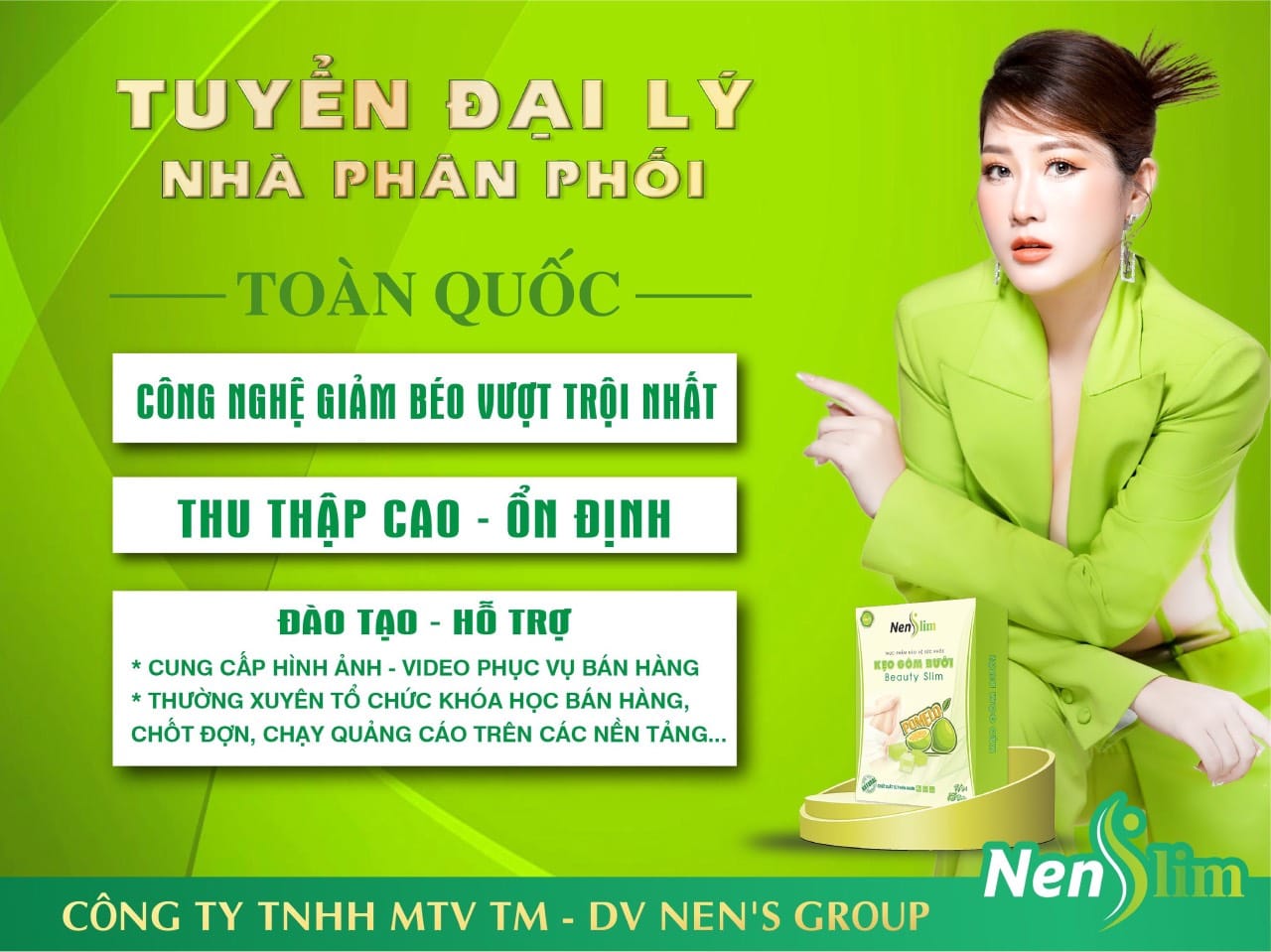 Bạn muốn gia nhập hệ thống có chính sách tốt, giá sỉ tốt, hỗ trợ đào tạo chuyên nghiệp trên tất cả các kênh online. Đây là sự lựa chọn tót nhất khi bạn kinh doanh kẹo gôm bưởi giảm cân Nenslim đang rất hot trên thị trường hiện nay. Kinh doanh kẹo gôm bưởi giảm cân Nenslim với chúng tôi bạn sẽ được đào tạo những chiến lược mới nhất, hỗ trợ tối đa về chính sách và được tham gia các sự kiện của công ty.