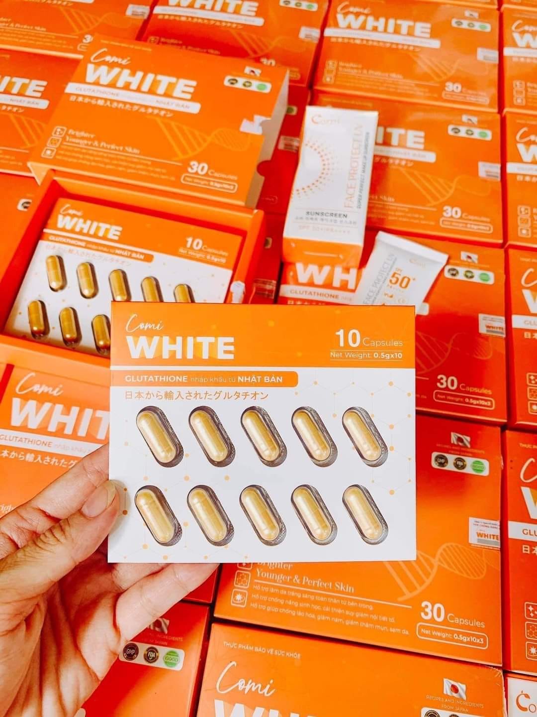 + Với Glutathion, Lcystine, nhau thai cừu, Vitamin C, Củ mài, Thiên môn chùm, Comi White giúp da trắng sáng toàn thân, chống lão hóa giảm thâm mụn, chống nắng nội sinh, cân bằng nội tiết tố, tăng cường sức đề kháng.
