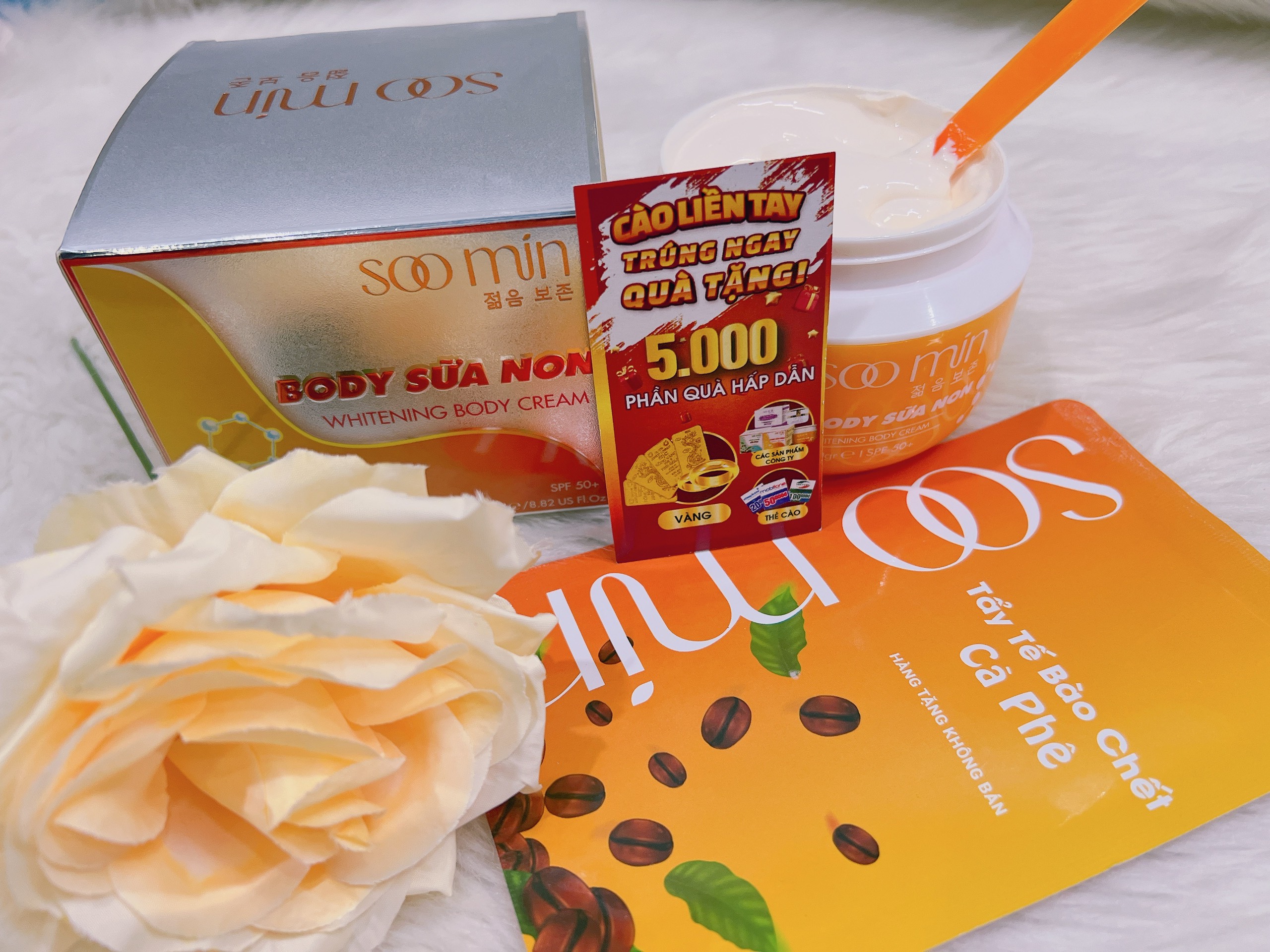 Mua 2h body sữa non Soo Min giá gốc 498k giảm còn 338k tặng 2 gói tẩy tế bào chết cafe + miễn phí ship